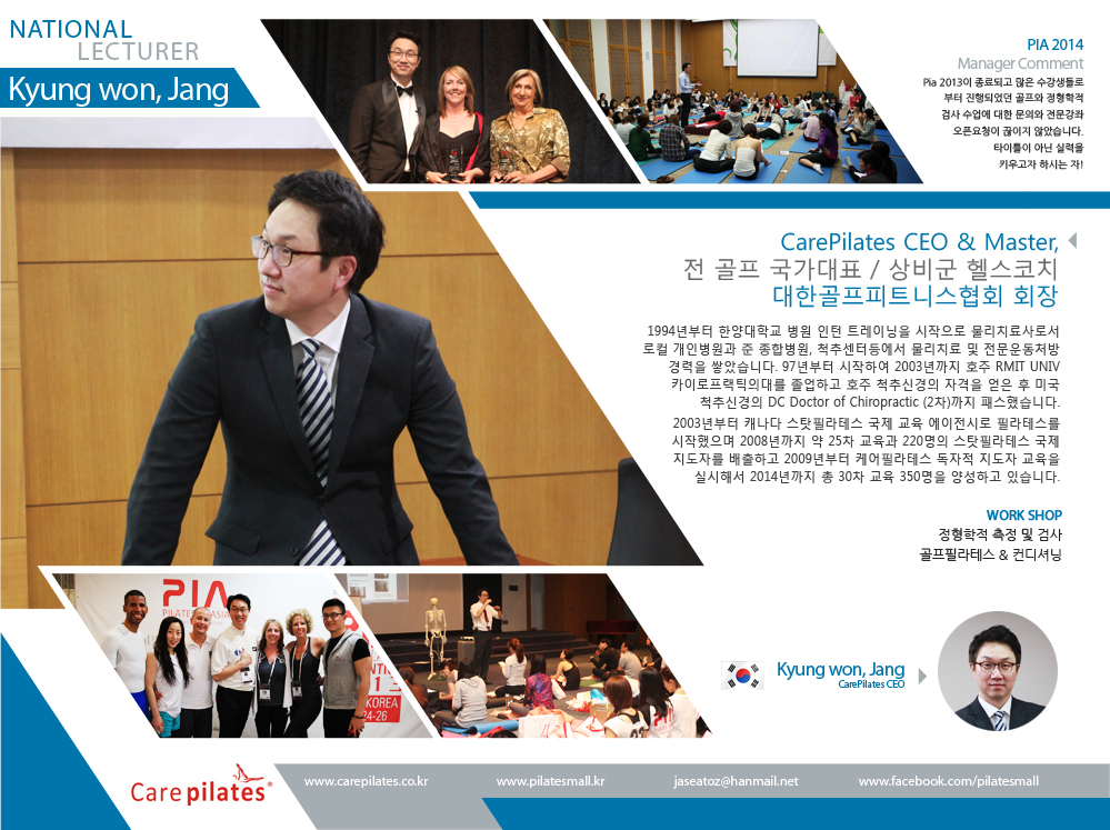 | Time : 2014. 06. 06 (fri) pm 1:10 ~ 4:10 Venue : R7 Composition : Practice 50% + Theory 50% Capacity : 40 per Qualification for application : Pilates, Fitness, Yoga, Medical Certificated |