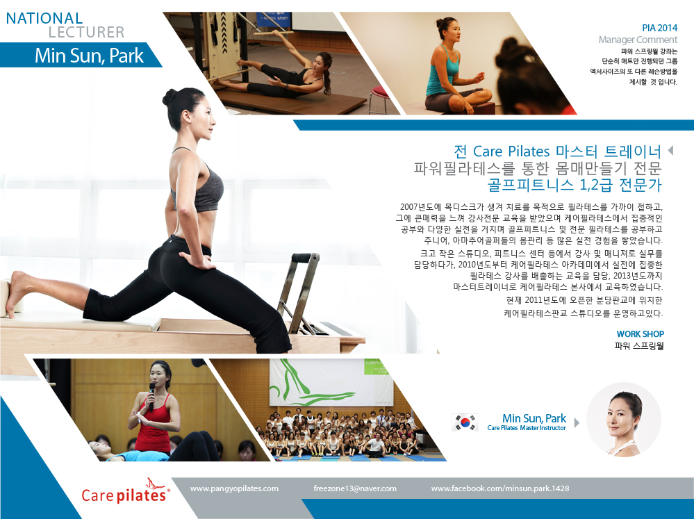 | Time : 2014. 06. 06 (fri) pm 1:10 ~ 4:10 Venue : R3 Composition : Practice 70% + Theory 30% Capacity : 30 per Qualification for application : Pilates instructor(equipment Certificated) |