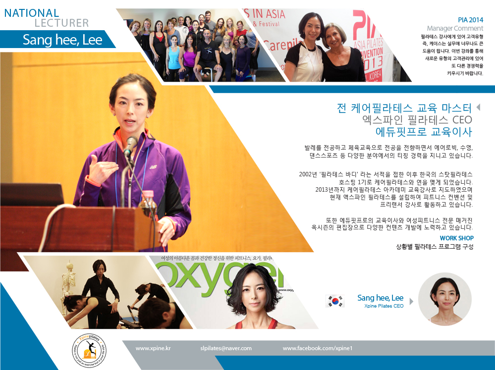 | Time : 2014. 06. 07 (sat) pm 1:00 ~ 3:00 Venue : R7 Composition : Practice 50% + Theory 50% Capacity : 40 per Qualification for application : Pilates instructor |